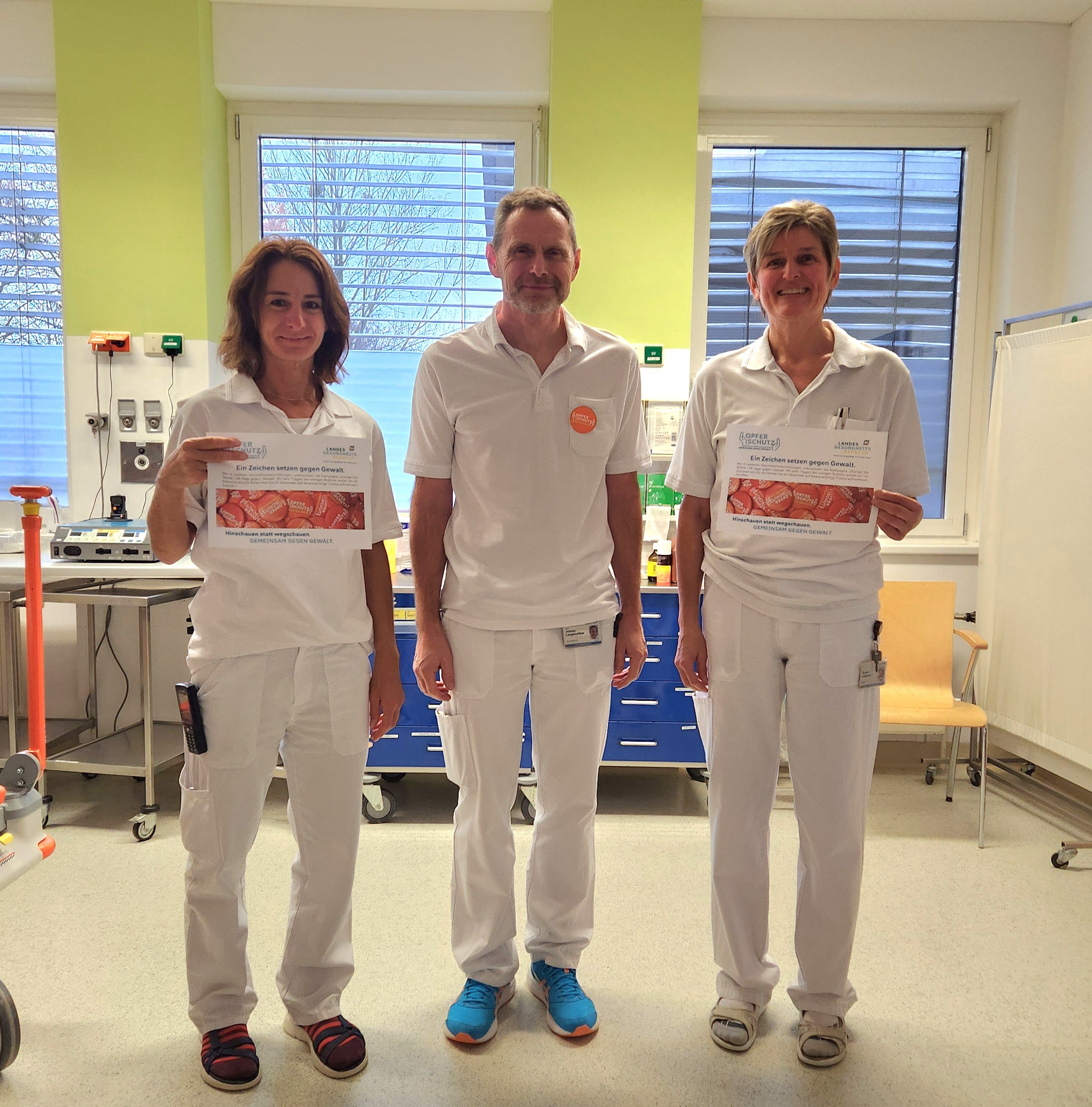 Mitarbeiterinnen und Mitarbeiter des Klinikums tragen in diesem Zeitraum orange Buttons, die als sichtbares Zeichen für Zivilcourage und Sensibilisierung stehen. Die Farbe Orange symbolisiert eine gewaltfreie Zukunft. Die Buttons werden ab sofort jedes Jahr wiederverwendet und sollen nachhaltig und bewusst eingesetzt werden.